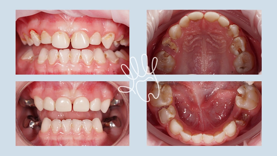 Przypadek kliniczny: Dziecko w wieku 2 lat było leczone w narkozie (inna placówka), po 2 latach leczenie w @hi5_dental przez lek. dent. Swietłanę Kozaczuk @sv.kozaczuk. Niestety żadna czwórka z wypełnieniem nie przetrwała, piątki i kły, których nie było na moment pierwszego leczenia w jamie ustnej, są agresywnie zaatakowane przez próchnicę. W trakcie zabiegu są odbudowane koronami stalowymi (piątki) i materiałem kompozytowym (kły). Odbudowa kompozytowa przy siekaczach górnych nieszczelna, próchnica wtórna zaatakowała zęby przydziąsłowo z każdej strony. Zęby po oczyszczeniu próchnicy odbudowano koronami cyrkonowymi.