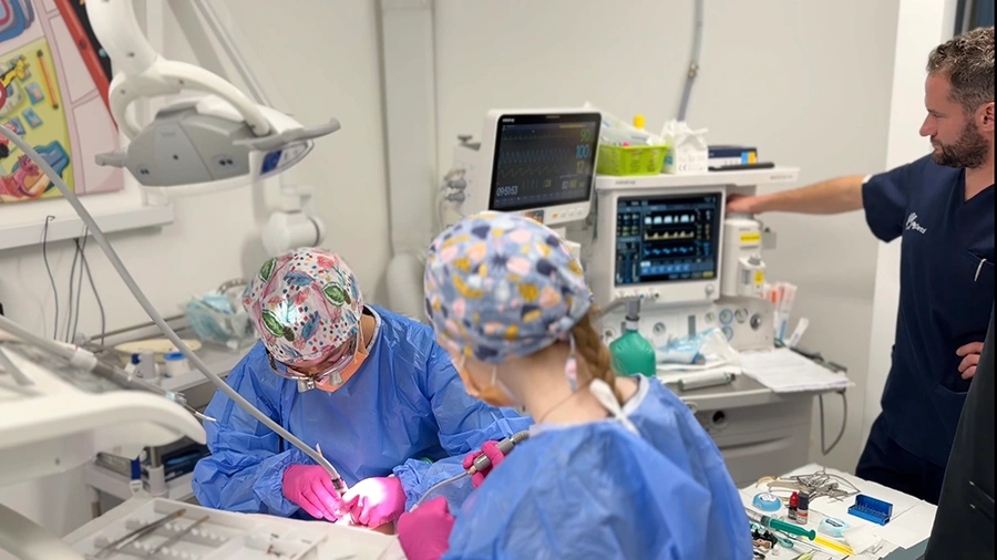 Kompleksowe leczenie wszystkich zębów w czasie jednej wizyty. Po zaśnięciu dziecka wykonujemy zdjęcia fotograficzne, rentgenowskie i potwierdzamy plan leczenia.